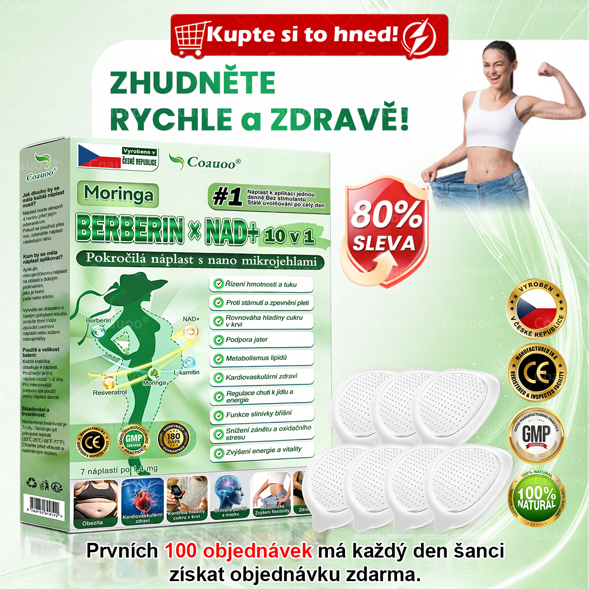 𝐂𝐨𝐚𝐮𝐨𝐨® 𝐌𝐨𝐫𝐢𝐧𝐠𝐚 × 𝐁𝐞𝐫𝐛𝐞𝐫𝐲𝐧𝐚 × 𝐀𝐌𝐏𝐊 𝟏𝟎 v 1 – Štíhlý a zdravý nano mikrojihlový náplast je výsledkem více než 20 let výzkumu, na kterém se podílelo přes 30 odborníků, a je navržen pro všechny dospělé bez ohledu na typ postavy.Díky síle Glumasetidu a přírodních extraktů tento nano mikrojihlový náplast dodává aktivní látky přes pokožku, podporuje zdravou rovnováhu krevního cukru, kontrolu chuti k jídlu a metabolismus tuků, čímž umožňuje postupné a dlouhodobé řízení tělesné hmotnosti — bez tablet a injekcí.Obohacený o kolagenové peptidy (Collagen Peptides) pomáhá během hubnutí udržovat pevnost pokožky a zároveň podporuje trávení, zdraví střev a ženské zdraví, hladinu energie, snížení únavy a celkovou metabolickou rovnováhu.Vyrábí se v výrobních závodech s certifikací GMP (GMP-certified facilities), v souladu s normami České republiky a Evropské unie, a s certifikací CE, což zajišťuje bezpečné, vědecky podložené řešení bez jehel pro účinnou kontrolu hmotnosti a podporu každodenního zdraví.