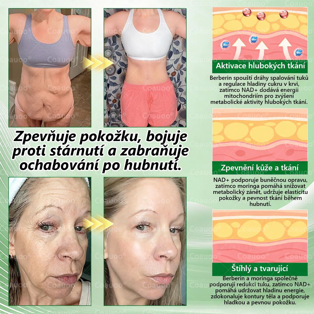 Rychlé hubnutí často vede k povolené, ochablé pokožce a k výraznému snížení její elasticity. 𝐂𝐨𝐚𝐮𝐨𝐨® tento problém řeší obohacením své formule o kolagenové peptidy a složky podporující tvorbu kolagenu, které pomáhají obnovit pevnost a tloušťku pokožky.Tyto klíčové složky stimulují syntézu kolagenu a elastinu, zpevňují pokožku, vyhlazují jemné vrásky, snižují ochabování a navracejí mladistvý, zdravý jas. Díky tomu nejen účinně hubneš, ale zároveň si zachováváš pevnou, mladistvě vypadající postavu — bez efektu „štíhlý, ale starší“. Hubnutí a omlazení probíhají současně.Formuli dále posilují účinné molekuly proti stárnutí a pro zpevnění pokožky. NAD⁺/NMN podporují regeneraci buněk a stimulují tvorbu kolagenu pro anti-aging efekt; Omega-3 pomáhá vázat vlhkost pro dlouhotrvající hladkost; zelený čaj, kurkuma a moringa poskytují silnou antioxidační a protizánětlivou ochranu; hořčík podporuje regeneraci pokožky a hlubokou hydrataci; zatímco silymarin detoxikuje, projasňuje a podporuje čistotu pleti.Toto pokročilé, synergické složení poskytuje nejen vyhlazující a protivráskový účinek, ale také napomáhá regeneraci ochablé pokožky po hubnutí — obnovuje její pevnost, pružnost a odolnost. Klinicky ověřené výsledky: již během 4 týdnů zaznamenalo více než 82 % uživatelů lepší hydrataci, hladší jemné linie, pevnější pokožku a viditelný liftingový efekt — a to i po výrazném úbytku hmotnosti, s návratem mladistvého, tvarovaného vzhledu.